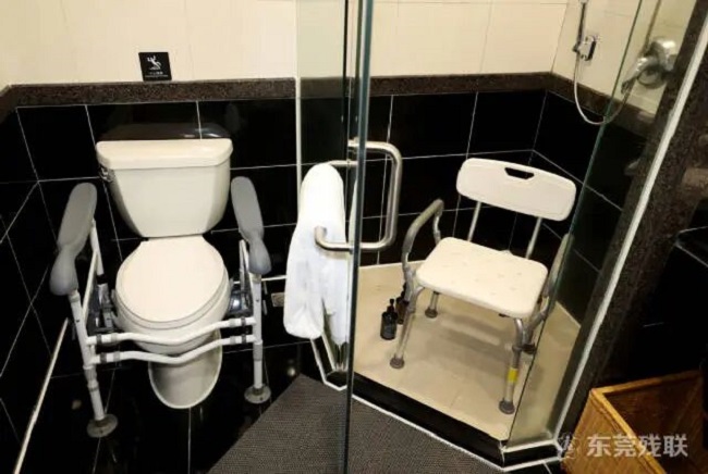 图为残特奥会举重比赛接待酒店内的浴室扶手、低位花洒和淋浴椅