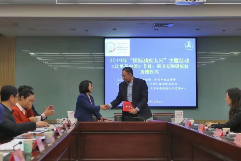 2019年12月2日,“国际残疾人日”前一天,中国残疾人联合会机关举行了一场特殊的捐赠仪式。人民出版社、中国广播影视出版社、北京中视雅韵文化传播中心共同践行文化助残理念,向中国残联捐赠纪录片《这里是中国》及同名图书无障碍版权,为特殊人群献上一份文化大礼。