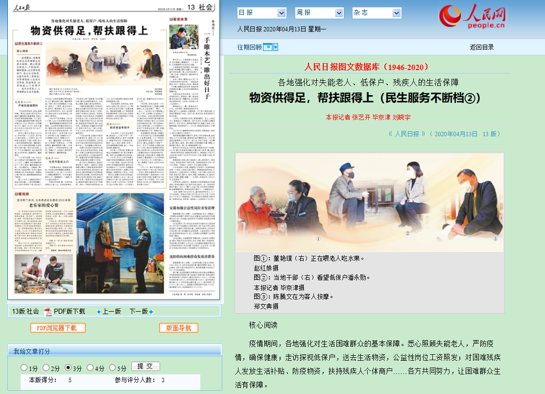 人民日报 各地强化对失能老人、低保户、残疾人的生活保障
