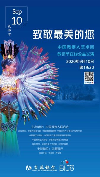 在第36个教师节这个特殊的日子,交通银行携手中国残联、中国残疾人艺术团等机构共同举办“致敬最美的您”——中国残疾人艺术团教师节在线公益演出,于2020年9月10日19:30在交通银行手机银行、央视频、中国网同步播出。