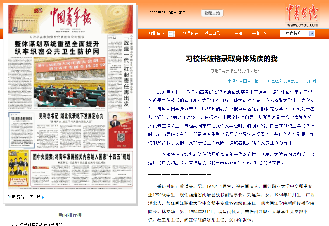 中国青年报 习校长破格录取身体残疾的我——习近平与大学生朋友们