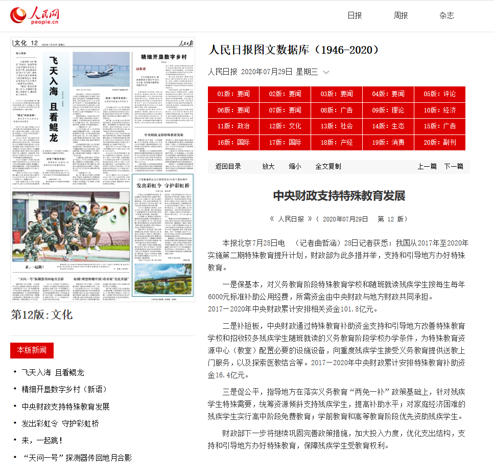 人民日报 中央财政支持特殊教育发展