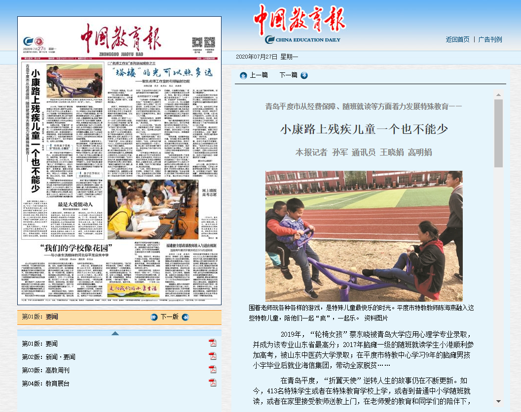 中国教育报 青岛平度市从经费保障、随班就读等方面着力发展特殊教育——小康路上残疾儿童一个也不能少
