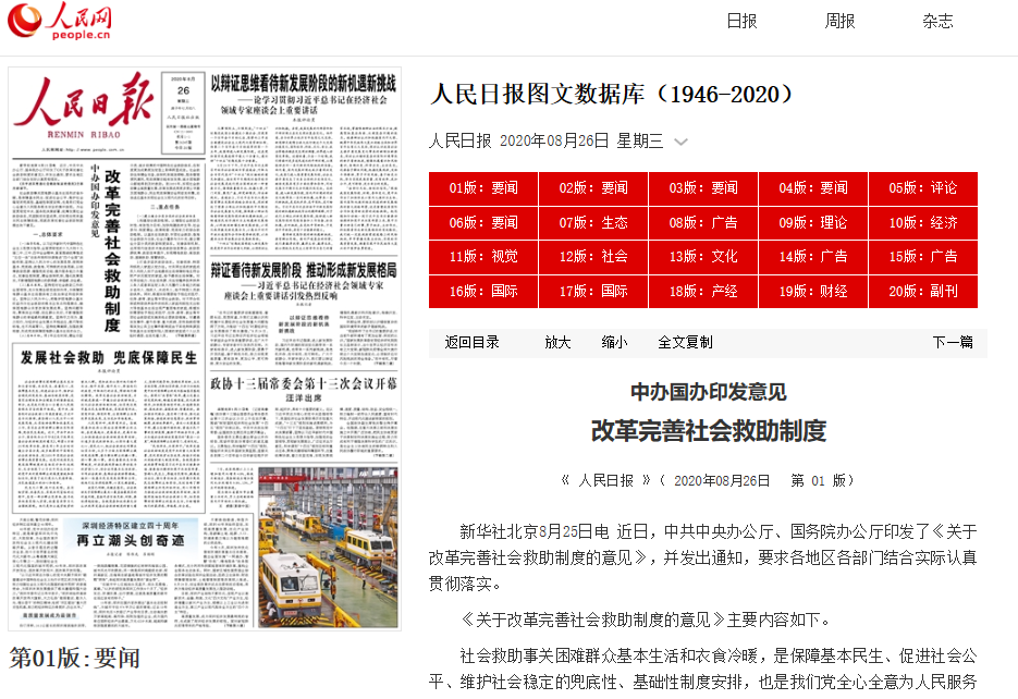 人民日报 中办国办印发意见 改革完善社会救助制度