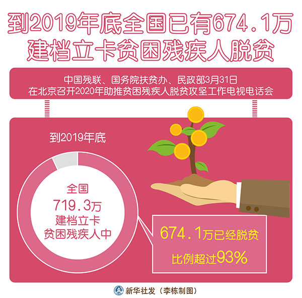 新华社北京3月31日电(记者孙少龙)中国残联、国务院扶贫办、民政部31日在京召开2020年助推贫困残疾人脱贫攻坚工作电视电话会。记者从会上了解到,到2019年底,全国719.3万建档立卡贫困残疾人中,674.1万已经脱贫,比例超过93%。