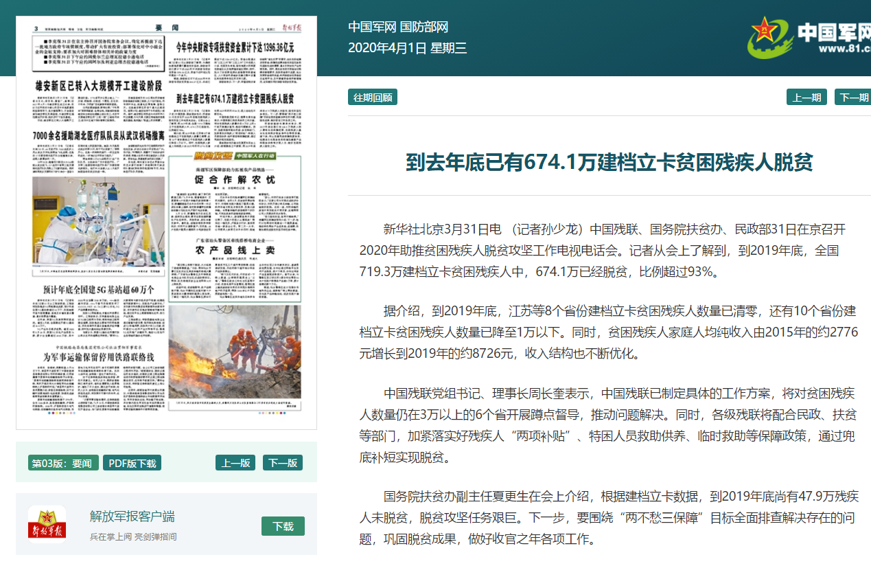 解放军报 到去年底已有674.1万建档立卡贫困残疾人脱贫