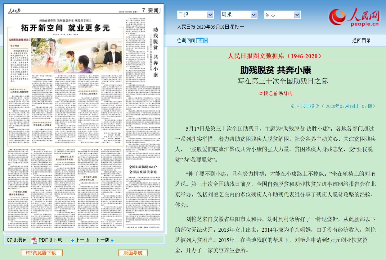 人民日报 助残脱贫 共奔小康——写在第三十次全国助残日之际