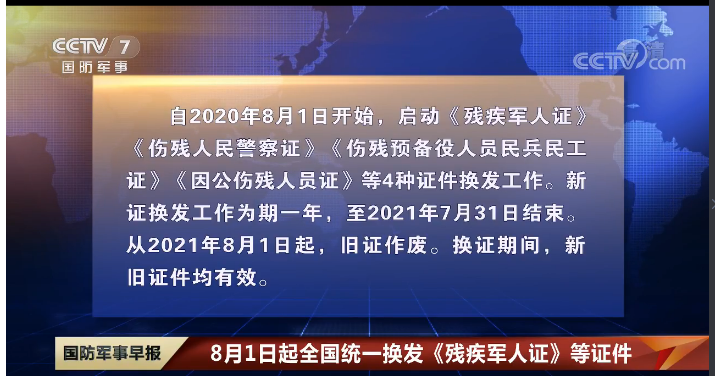 中央电视台《国防军事早报》8月1日起全国统一换发《残疾军人证》等证件