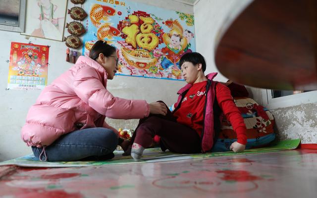 ↑12月17日,特教老师刘笑蕾(左)在学生畅畅(化名)家中协助进行肢体康复训练。
