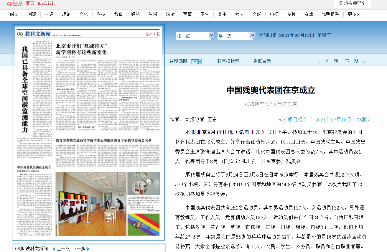 光明日报 中国残奥代表团在京成立 张海迪率437人出征东京