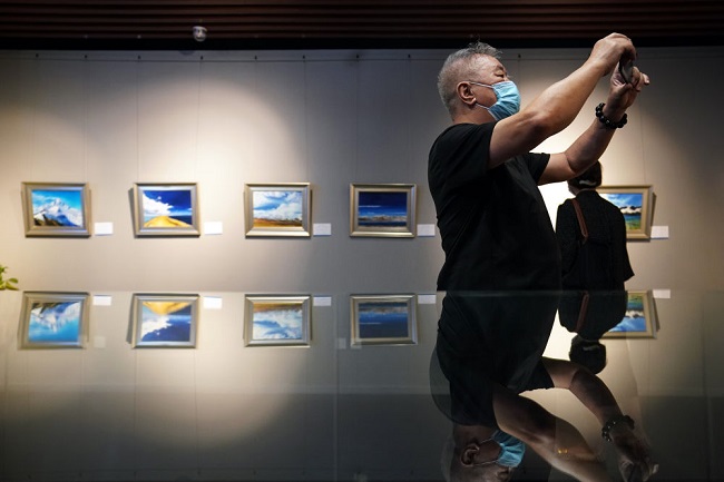 图为7月26日,参观者在“共享芬芳·共铸美好”心之所向——张俊莉油画展上参观