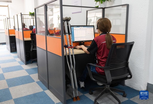 图为在北京圆通速递助残基地暨北京共享客服中心,一名残疾人员工在工作(2021年5月16日摄)。新华社记者 才扬 摄