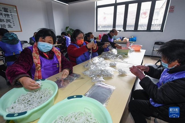 图为在浙江湖州市织里镇港西村残疾人之家,来自周边的残疾人正在打包配件(2022年2月22日摄)。完成工作后,他们可以获得相应报酬和补贴。新华社记者 徐昱 摄