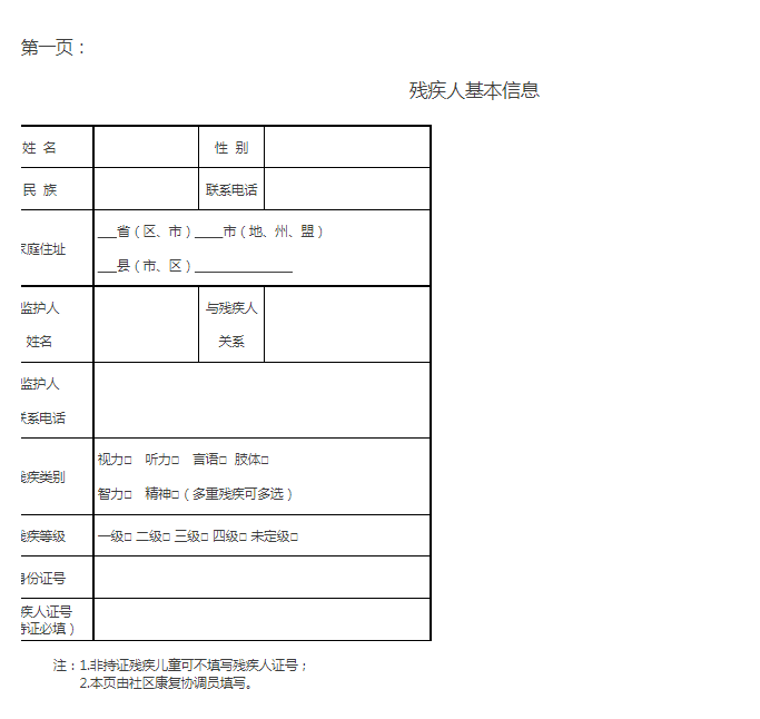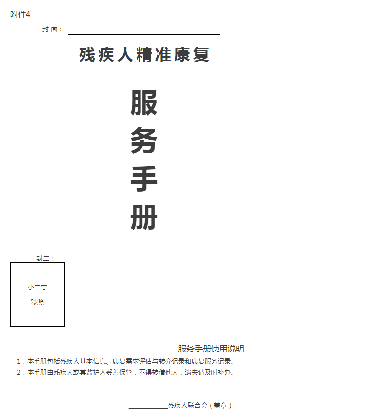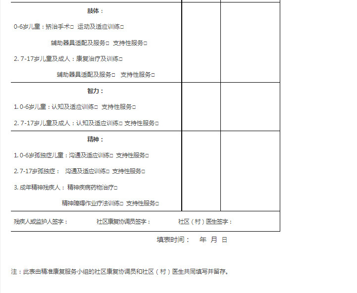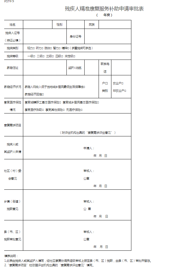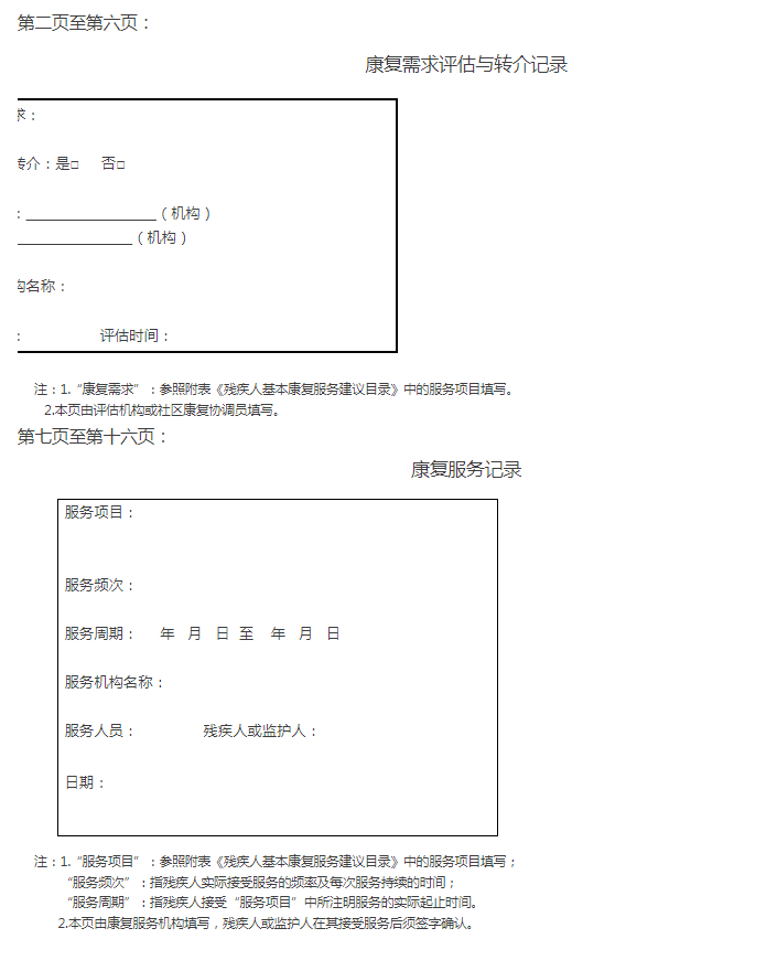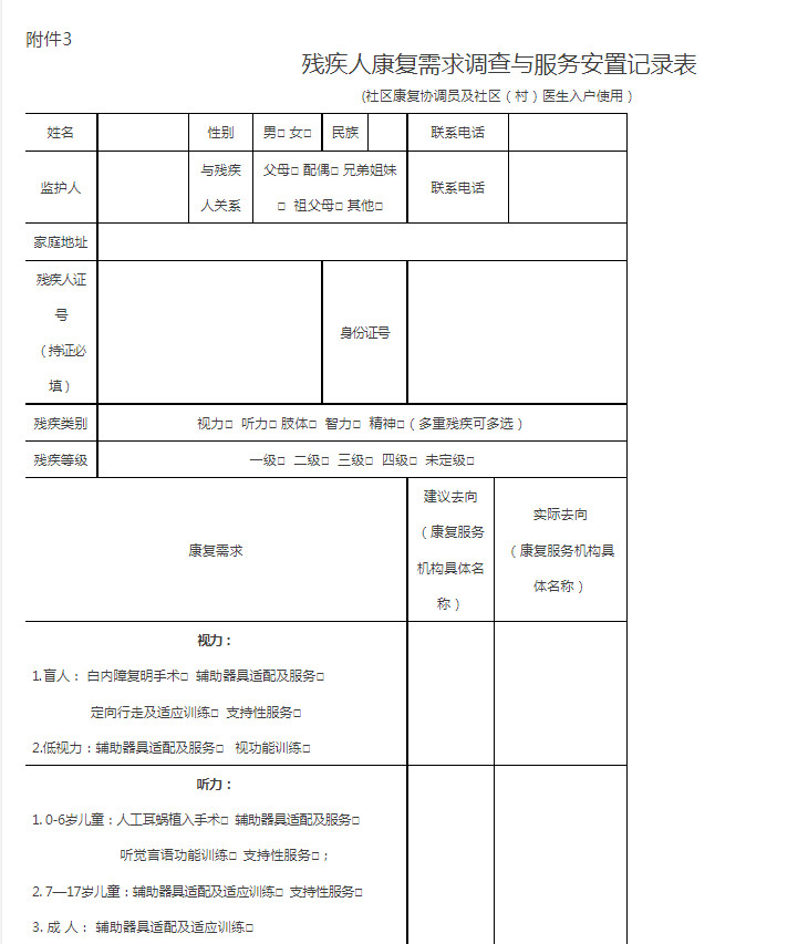 (四)严格流程操作。康复服务人员入户开展康复需求评估,填写《残疾人康复需求调查与服务安置记录表》(附件3),同时向有康复需求的残疾人发放《残疾人精准康复服务手册》(附件4)。对康复需求明确的残疾人,可直接转介至康复服务机构,对不能明确康复需求的残疾人,将其转介至具备条件的评估机构。对行动不便的残疾人,可组织专业人员提供上门评估。残疾人根据康复需求评估意见,到康复服务机构接受服务。对本地区确定为免费服务的项目,残疾人持康复服务手册到残联、卫生计生等部门确定的定点康复服务机构接受服务,定点机构为其制定个性化康复服务方案、实施服务并建立康复档案,所需服务经费与项目实施地残联结算;确定为定额补助服务项目的,由符合条件的残疾人填写《残疾人精准康复服务补助申请审批表》(附件5)向项目实施地残联提出补助申请。