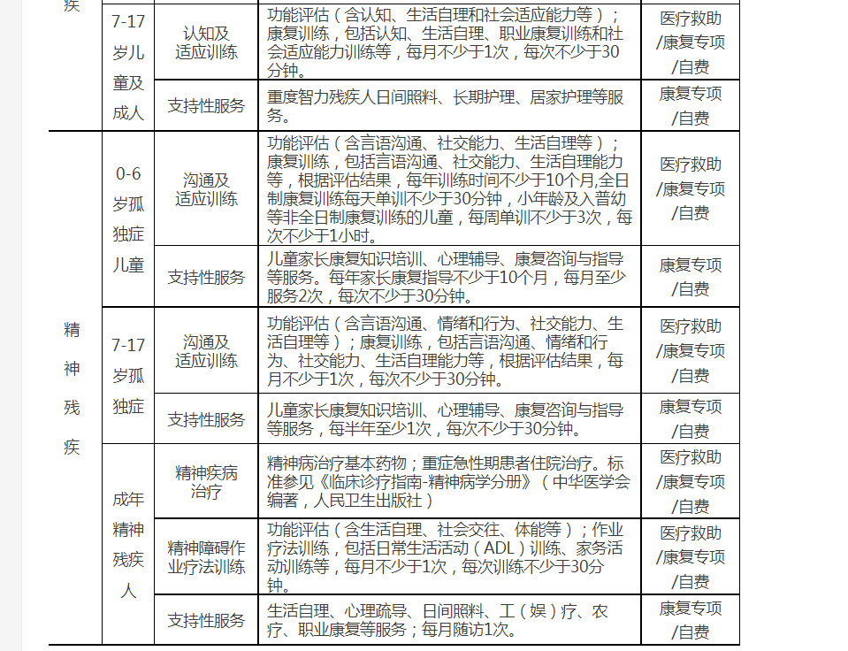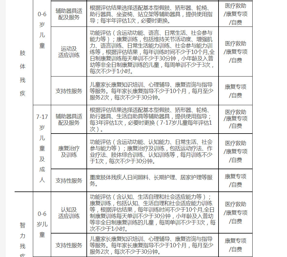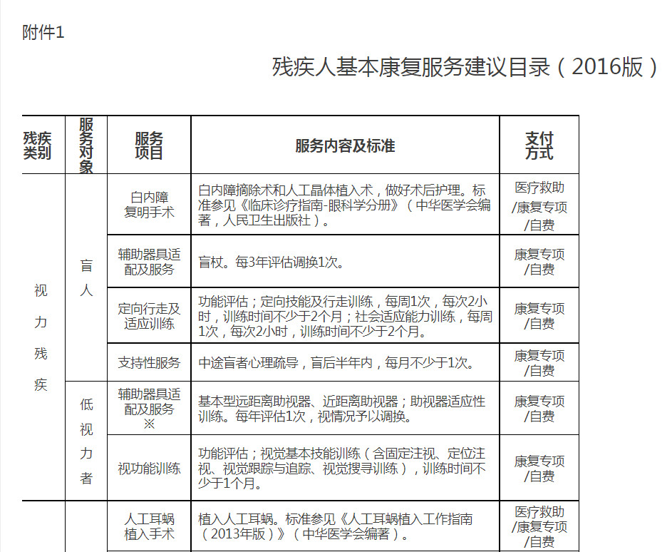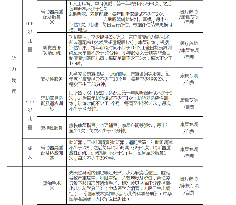 3.标注“※”的服务项目必须配套提供其他相应服务才能视为获得康复服务,低视力者适配助视器后须提供视功能训练,0-6岁听力残疾儿童适配人工耳蜗或助听器后须提供听觉言语功能训练,0-6岁肢体残疾儿童接受矫治手术后须提供运动及适应训练和必要的辅助器具。