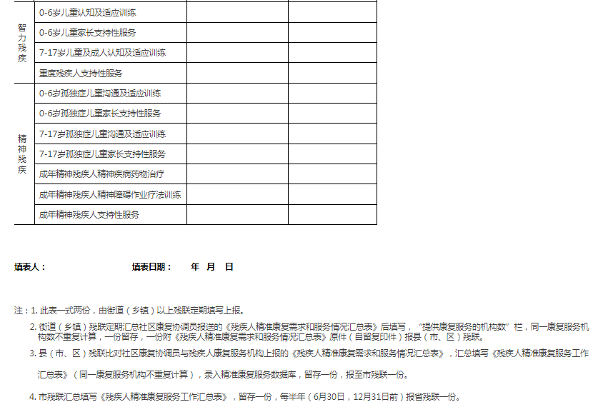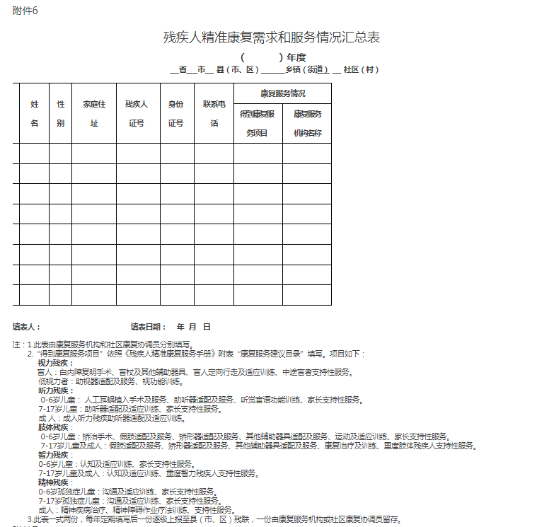 1. 定点康复服务机构为残疾人实施康复服务后,负责将相关服务情况记录在精准康复服务手册上;康复服务机构、社区(村)康复协调员分别填写《残疾人精准康复需求和服务情况汇总表》(附件6),每月报送至县(市、区)残联。