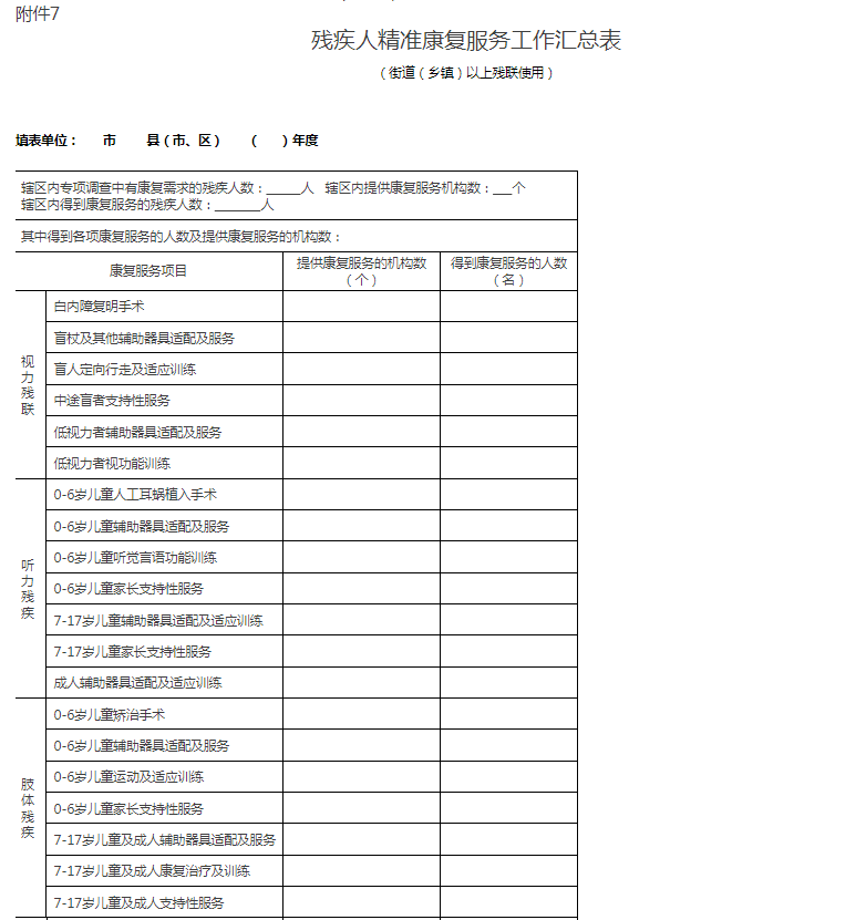 2. 县(市、区)残联每月对康复服务机构、社区(村)康复协调员报送的信息进行比对,审核无误后,将相关信息录入残疾人精准康复服务数据库,填报《残疾人精准康复服务工作汇总表》(附件7)。各市及省直管县每半年(6月30日、12月31日前)报送省残联。