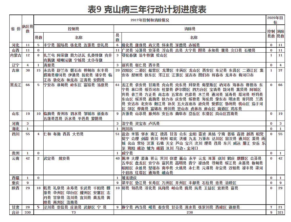 (1)综合施策巩固克山病防控成果。在克山病病区落实综合防治措施,控制急型、亚急型克山病的发生。结合脱贫攻坚和乡村振兴战略,调整优化种植结构,在防寒、防烟、防潮等方面改善居住条件,降低致病风险,实现急型、亚急型克山病零发病。(国家卫生健康委牵头,会同农业农村部、国务院扶贫办等部门落实,河北、山西、内蒙古、辽宁、吉林、黑龙江、山东、河南、湖北、重庆、四川、贵州、云南、西藏、陕西、甘肃等16个省、自治区、直辖市人民政府承担地方落实责任)