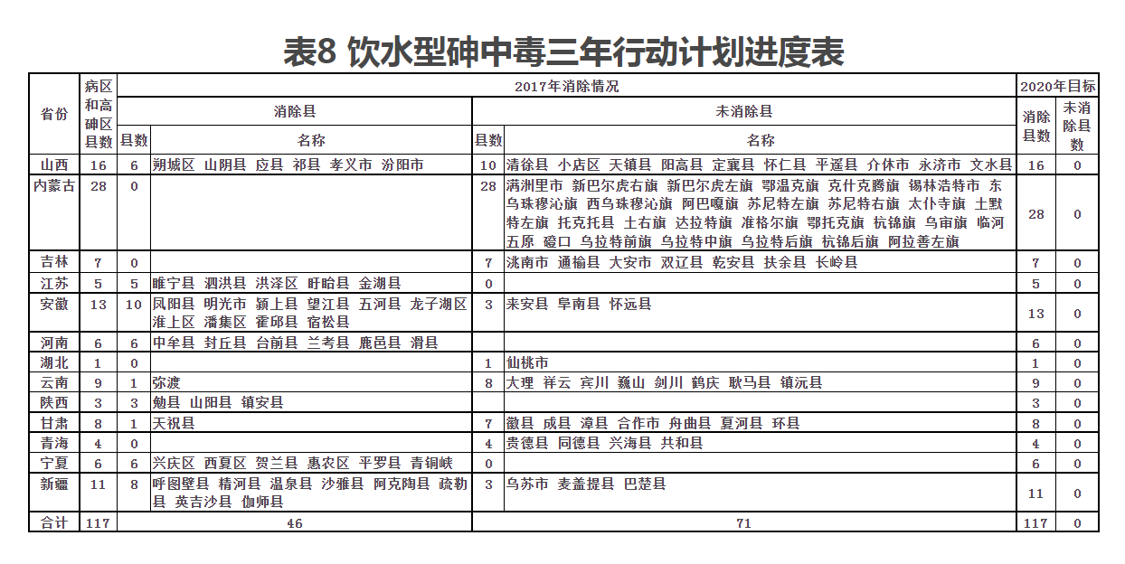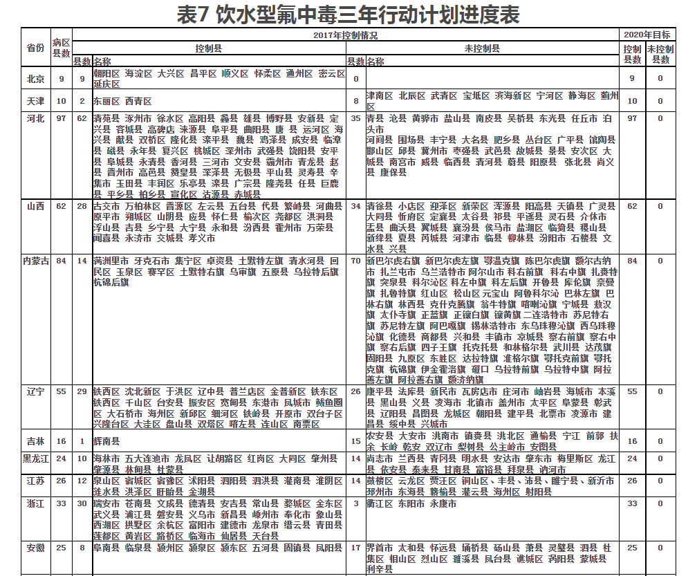 各地在2018年底前全面摸清饮水型氟砷中毒病区、水源性高碘病区底数,分析原因,加强顶层设计,综合考虑优质水源置换、城镇供水管网延伸、建设规模化供水工程以及对现有供水工程强化水质净化处理等方式,因地制宜,合理确定解决方案,不断提升水质达标率。(国家卫生健康委牵头,会同水利部、国家发展改革委、生态环境部等部门落实,北京、天津、河北、山西、内蒙古、辽宁、吉林、黑龙江、江苏、浙江、安徽、福建、江西、山东、河南、湖北、湖南、广东、广西、重庆、四川、云南、西藏、陕西、甘肃、青海、宁夏、新疆等28个省、自治区、直辖市人民政府和新疆生产建设兵团承担地方落实责任)