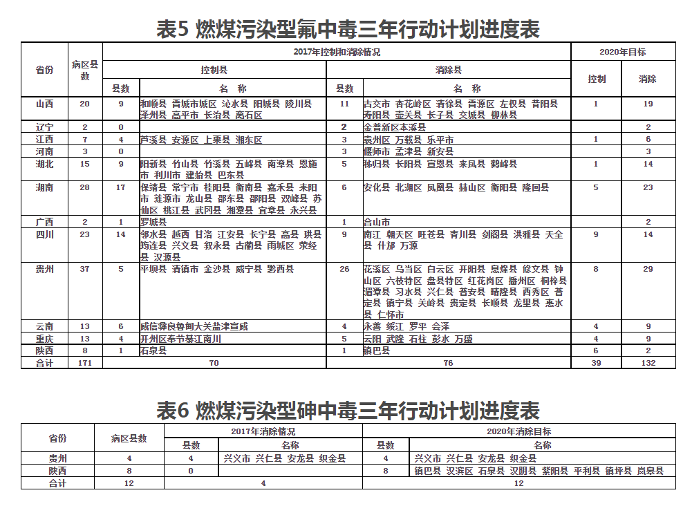 (2)加强燃煤污染型氟砷中毒防治措施后期管理和维护。持续保持基本消除燃煤污染型氟砷中毒危害成果,加强对病区群众宣传教育,引导群众使用改良炉灶,做好改炉改灶后的维修服务。依法关闭高氟高砷煤矿,不让高氟高砷煤流入市场,推广清洁能源。(国家卫生健康委牵头,会同生态环境部、农业农村部等部门落实,山西、辽宁、江西、河南、湖北、湖南、广西、重庆、四川、贵州、云南、陕西等12个省、自治区、直辖市人民政府承担地方落实责任)