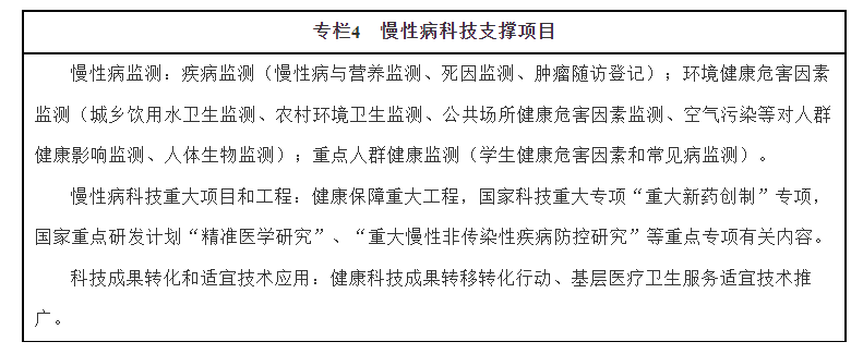 2.推动科技成果转化和适宜技术应用。系统加强慢性病防治科研布局,推进相关科研项目。进一步加强国家临床医学研究中心和协同创新网络建设,完善重大慢性病研究体系。以信息、生物和医学科技融合发展为引领,加强慢性病防治基础研究、应用研究和转化医学研究。统筹优势力量,推进慢性病致病因素、发病机制、预防干预、诊疗康复、医疗器械、新型疫苗和创新药物等研究,重点突破精准医疗、“互联网+”健康医疗、大数据等应用的关键技术,支持基因检测等新技术、新产品在慢性病防治领域推广应用。针对中医药具有优势的慢性病病种,总结形成慢性病中医健康干预方案并推广应用。结合慢性病防治需求,遴选成熟有效的慢性病预防、诊疗、康复保健适宜技术,加快成果转化和应用推广。开展慢性病社会决定因素与疾病负担研究,探索有效的慢性病防控路径。在专业人才培养培训、信息沟通及共享、防治技术交流与合作、能力建设等方面积极参与国际慢性病防治交流与合作。