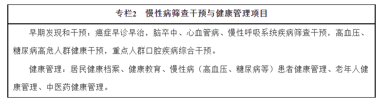 1.促进慢性病早期发现。全面实施35岁以上人群首诊测血压,发现高血压患者和高危人群,及时提供干预指导。社区卫生服务中心和乡镇卫生院逐步提供血糖血脂检测、口腔预防保健、简易肺功能测定和大便隐血检测等服务。逐步将临床可诊断、治疗有手段、群众可接受、国家能负担的疾病筛检技术列为公共卫生措施。在高发地区和高危人群中逐步开展上消化道癌、宫颈癌等有成熟筛查技术的癌症早诊早治工作。加强健康体检规范化管理,健全学生健康体检制度,推广老年人健康体检,推动癌症、脑卒中、冠心病等慢性病的机会性筛查。将口腔健康检查纳入常规体检内容,将肺功能检查和骨密度检测项目纳入40岁以上人群常规体检内容。