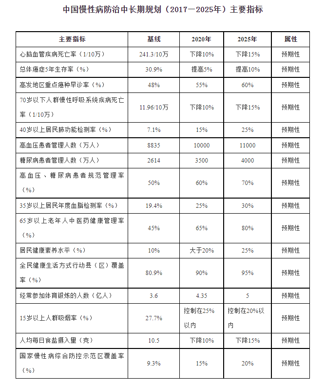 到2020年,慢性病防控环境显著改善,降低因慢性病导致的过早死亡率,力争30—70岁人群因心脑血管疾病、癌症、慢性呼吸系统疾病和糖尿病导致的过早死亡率较2015年降低10%。到2025年,慢性病危险因素得到有效控制,实现全人群全生命周期健康管理,力争30—70岁人群因心脑血管疾病、癌症、慢性呼吸系统疾病和糖尿病导致的过早死亡率较2015年降低20%。逐步提高居民健康期望寿命,有效控制慢性病疾病负担。
