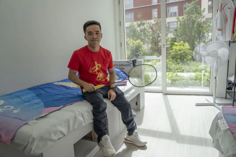 二楼的一所两居室是残奥羽毛球队林乃利、杨健远与教练的住处。走进其中的一间卧室,两张单人床呈对角摆放,上面覆盖着带有巴黎残奥会标识的床上用品。屋内采光明亮,推开玻璃门,可直接进入大楼内部的花园。两个卧室中间的客厅摆放着沙发、风扇与假肢等物品,洗手间则配备了无障碍设施。