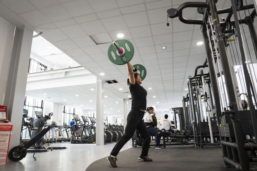 8月24日,巴黎残奥会中国体育代表团田径投掷运动员姚娟在残奥村健身房进行力量训练。新华社记者 才扬 摄