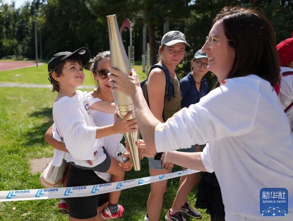 一名小朋友触摸火炬。新华社记者 贺灿铃 摄
