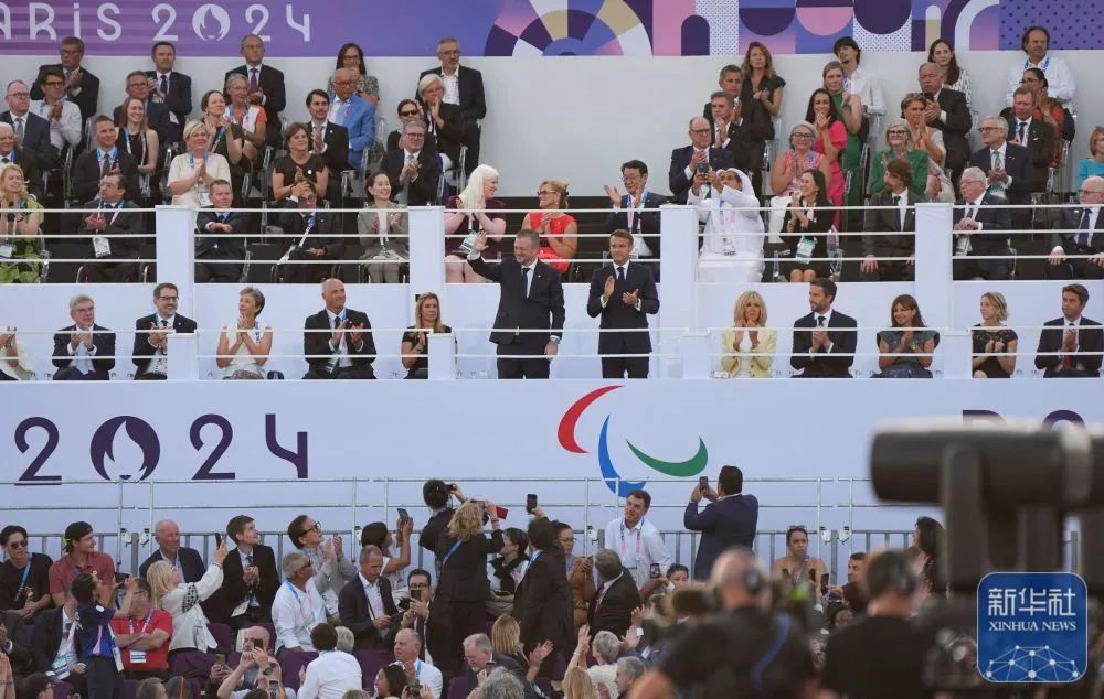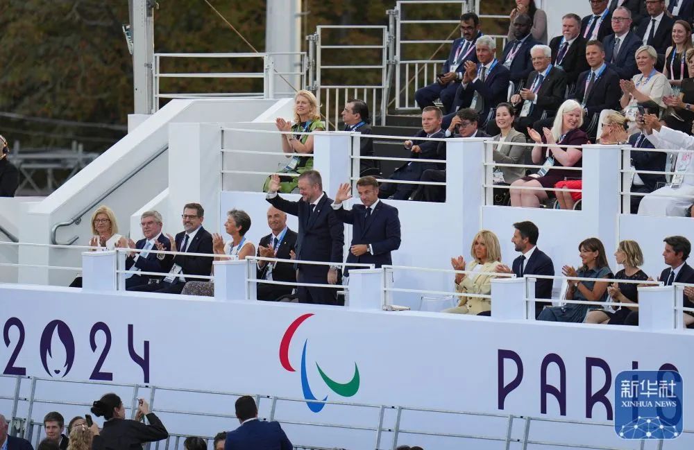 国际残奥委会主席安德鲁·帕森斯(前排左六)和法国总统马克龙(前排左七)向观众致意。新华社记者 邢广利 摄