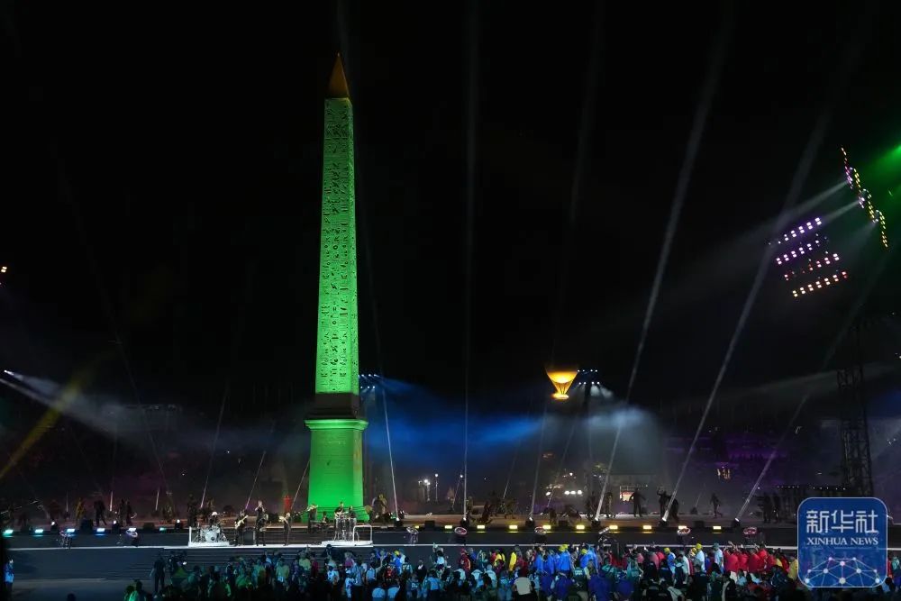 这是在开幕式上拍摄的协和广场方尖碑和远处的圣火。新华社记者 高静 摄
