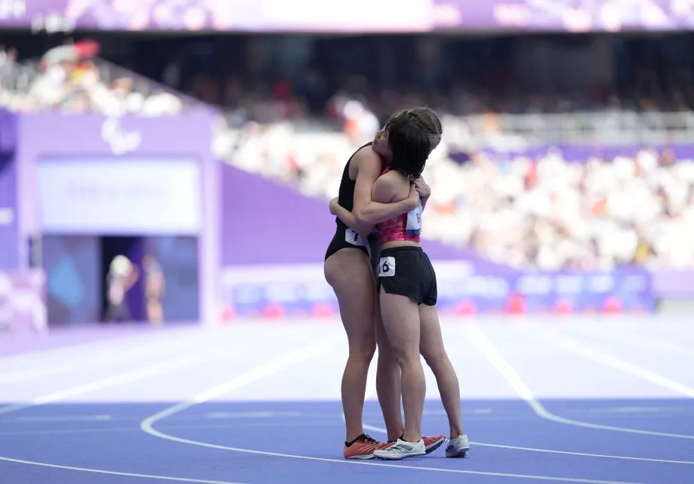 这是1日巴黎残奥会女子200米T36级决赛中的一幕。中国选手史逸婷以27秒50的成绩力压该项目世界纪录保持者、新西兰选手丹妮尔夺冠,同时打破残奥会纪录。撞线后的史逸婷,趴在丹妮尔身上许久直不起身。