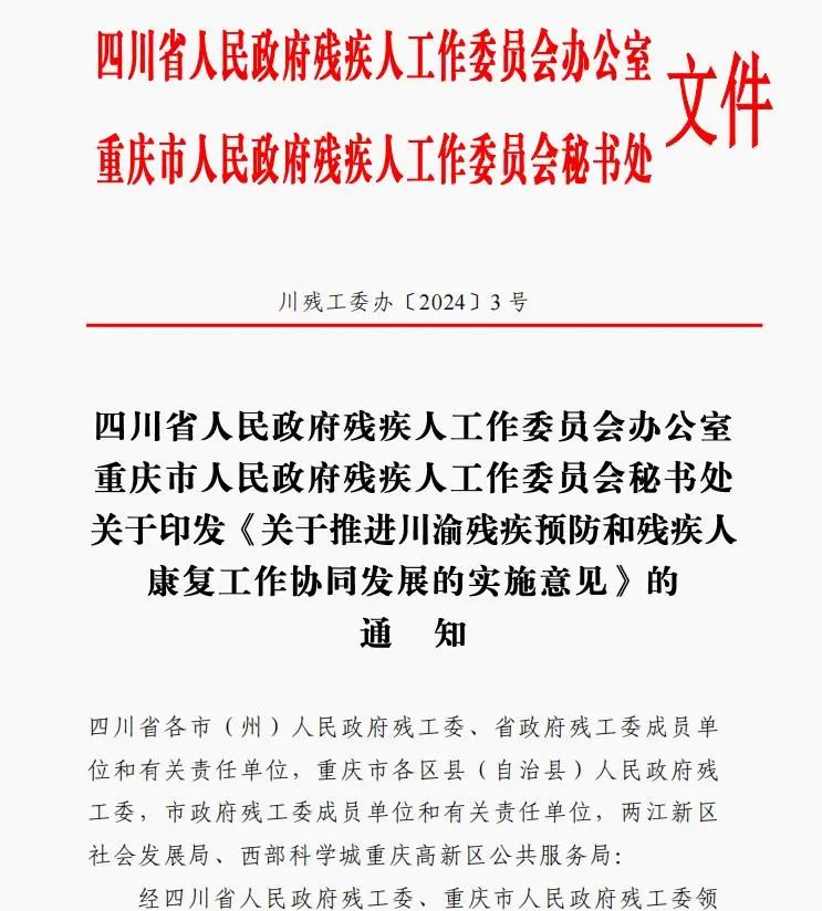 图为8月22日,《关于推进川渝残疾预防和残疾人康复工作协同发展的实施意见》印发
