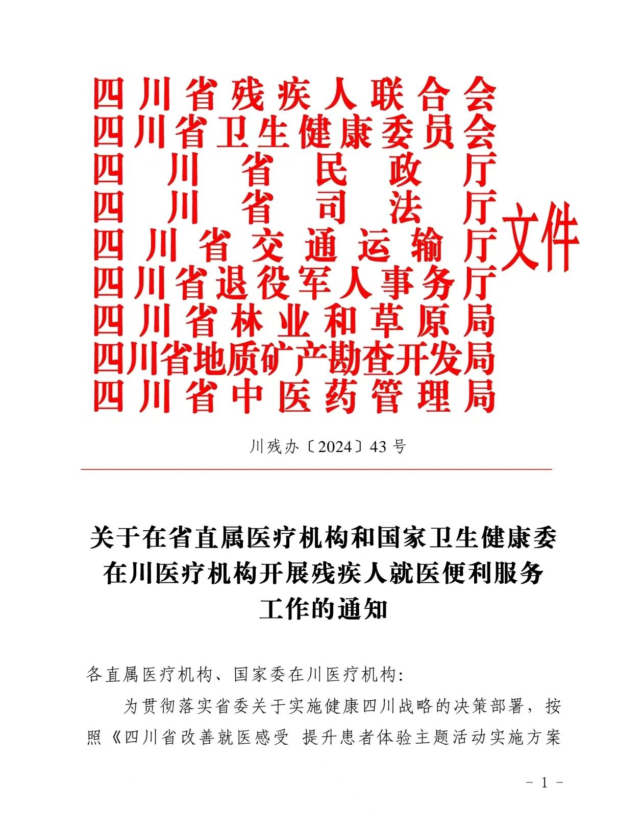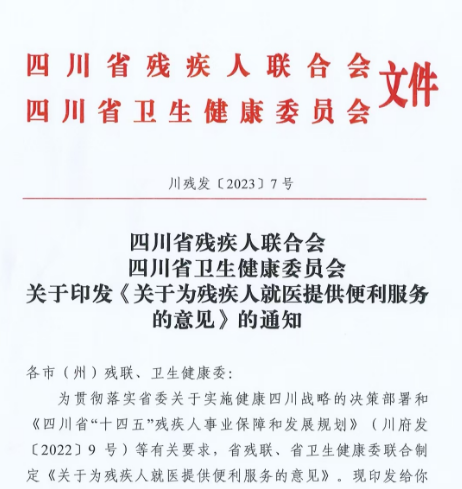 图为2024年12月2日,省残联、省卫生健康委等9部门联合印发《关于在省直属医疗机构和国家卫生健康委在川医疗机构开展残疾人就医便利服务工作的通知》