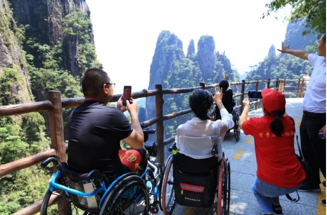 图为郴州莽山五指峰景区多年来着力打造山地旅游景区无障碍,是全国首家山地旅游无障碍景区,残疾人、老年人等可以全程无障碍旅游,是一座“不用爬的山”,吸引了全国各地的旅游者纷至沓来,社会效益、经济效益双丰收