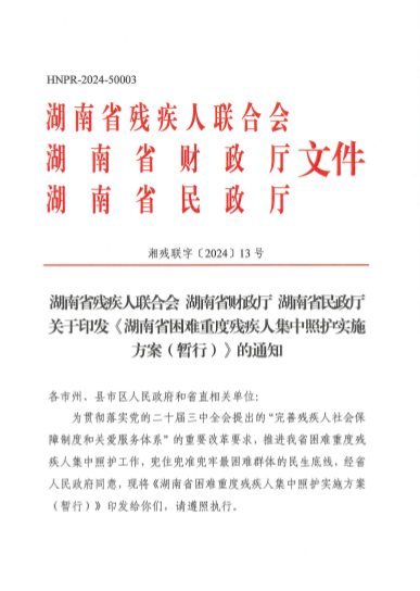 图为《湖南省关于建立困难重度残疾人集中照护制度的实施方案(暂行)》