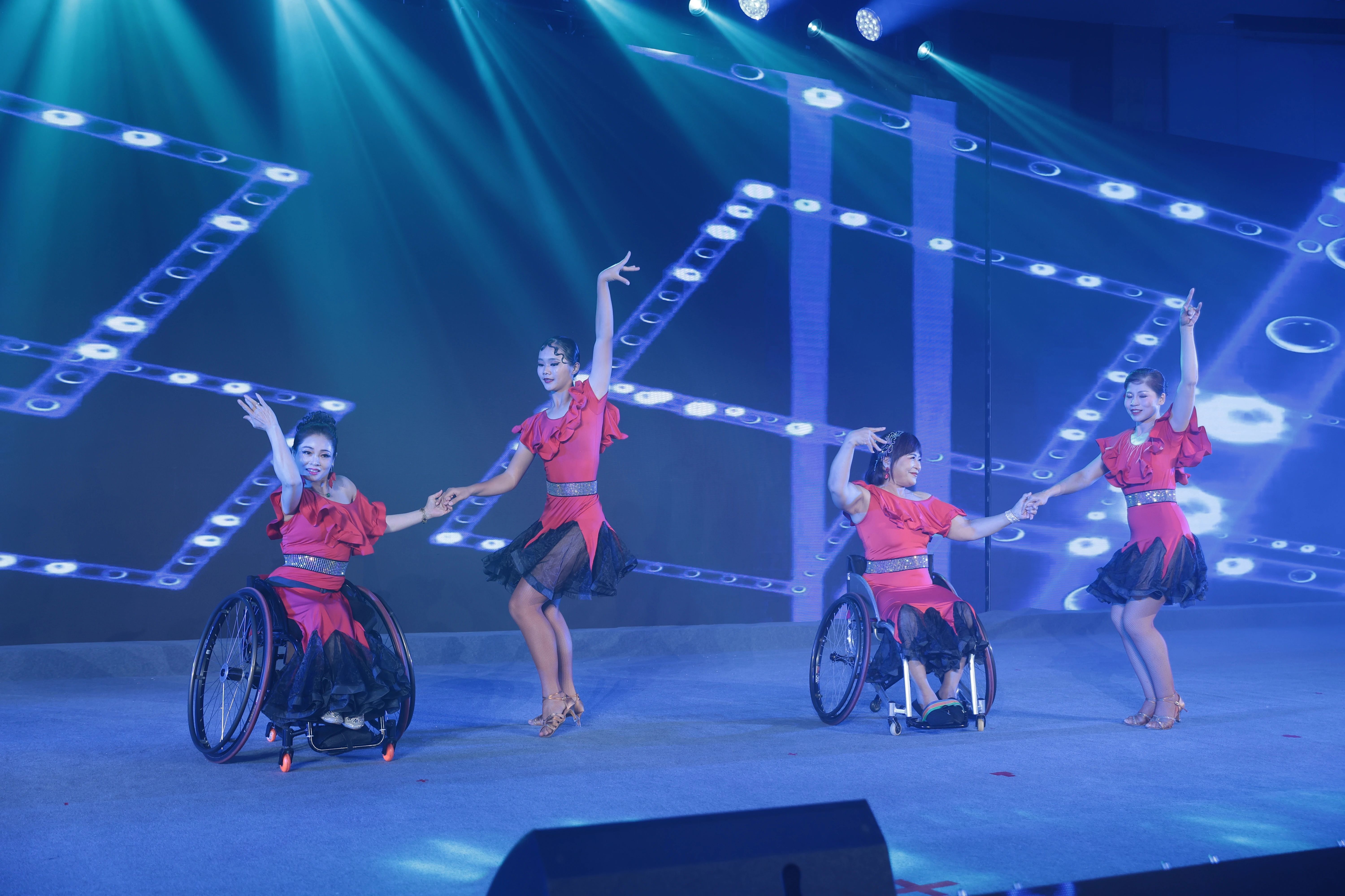 图为2024两岸残障人士交流嘉年华主题论坛文艺展演中,新北市轮椅体育运动舞蹈协会的舞者们带来热情洋溢的轮椅舞《舞与轮比》