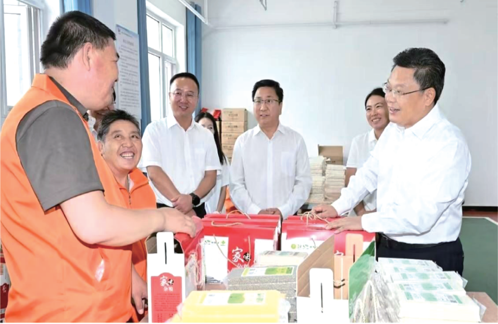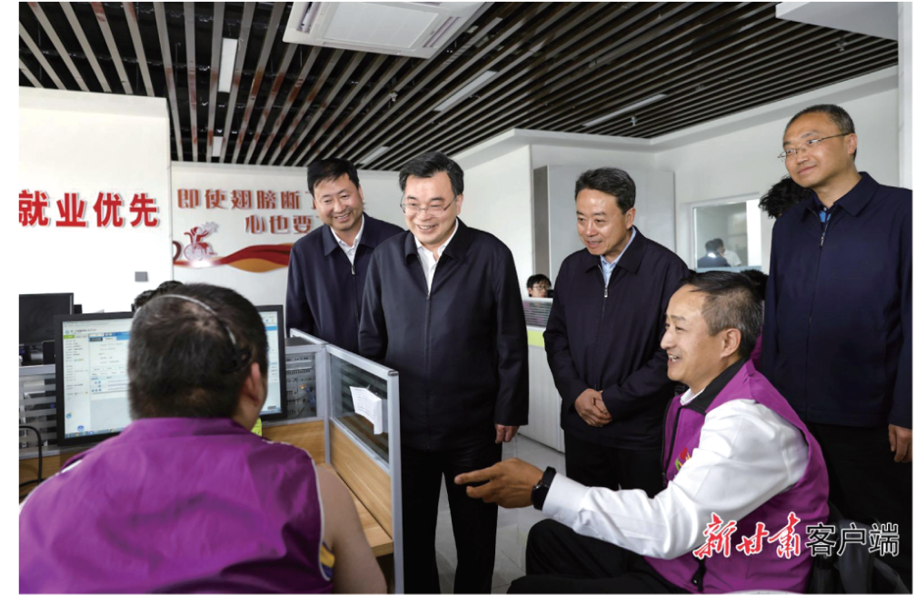 图为甘肃省委书记、省人大常委会主任胡昌升调研残疾人工作,了解重度残疾人通过技能培训实现较高质量就业情况