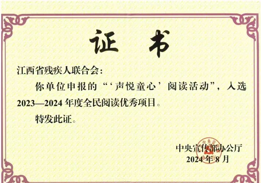 “声悦童心”阅读项目入选中宣部年度全民阅读优秀项目。牢牢把握“平等、融合、共享”价值理念,按照“听有亮点、触有形象、学有特色”要求,立足江西红色摇篮、绿色家园、古色厚土等资源禀赋,持续升级打造残疾人文化周特色品牌“声悦童心”阅读活动。联合省博物馆以“声音志愿者”为抓手,邀请全省中小学生为馆藏文物衍生形象“虎伢子”配音,设计“共护童梦”博物馆特殊儿童课程体系,走进全省各地特殊教育学校和残疾儿童康复服务机构“送课上门”,让残疾儿童跟着“虎伢子”徜徉文物、走遍江西,助力构建全省残健共融全民阅读多元化新格局。2024年,省残联“声悦童心”阅读活动入选中宣部年度全民阅读优秀项目(全国仅有20家单位入选),江西省残疾人联合会作为9个优秀代表单位之一在经验交流会作典型发言。