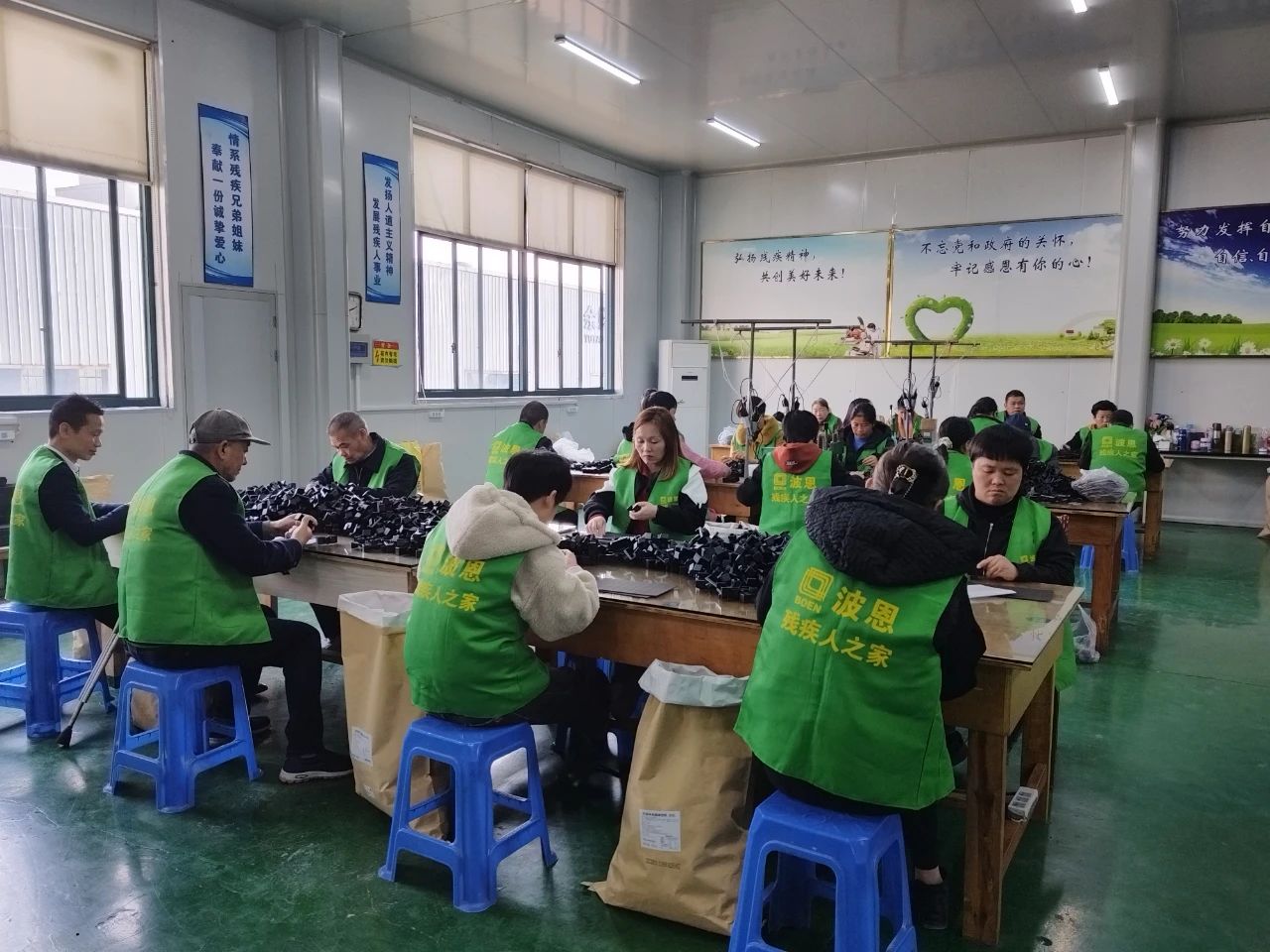图为残疾人在残疾人之家(工疗车间)的劳动场景