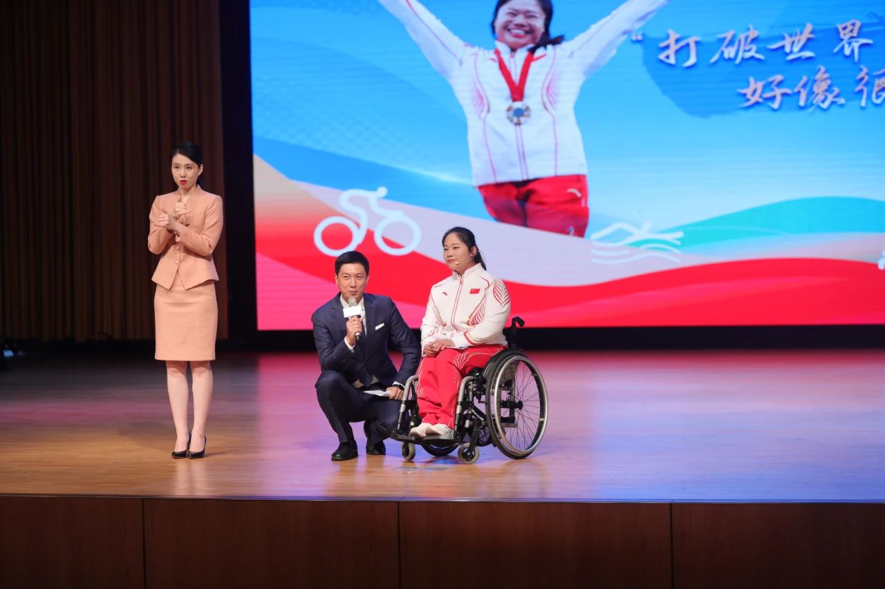 图为“勇立潮头 奋斗有我”——“我与残奥冠军面对面”宣讲活动,主持人采访举重冠军谭玉娇