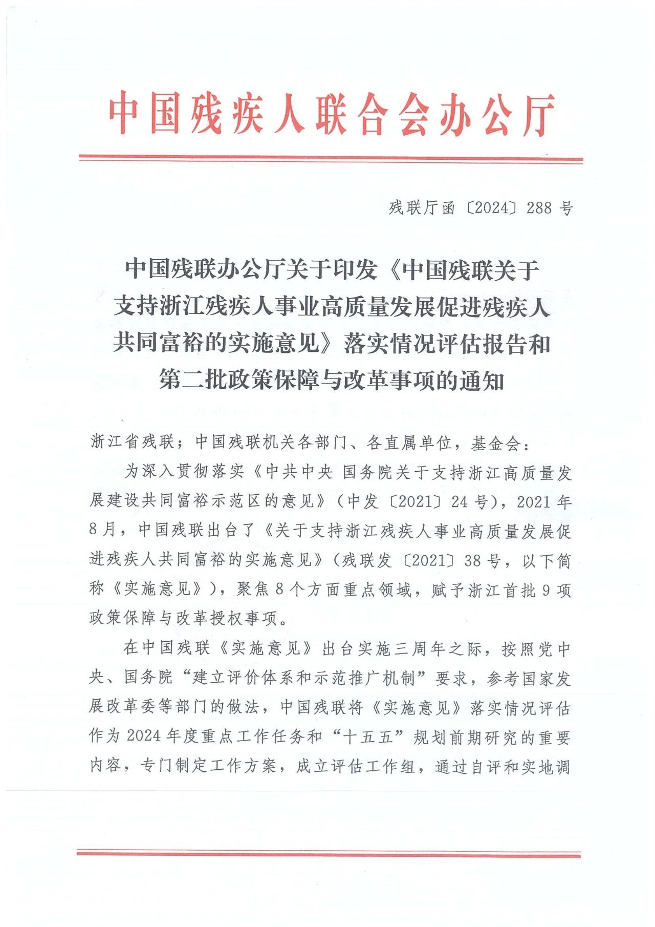 图为中国残联办公厅关于印发《中国残联关于支持浙江残疾人事业高质量发展促进残疾人共同富裕的实施意见》落实情况评估报告和第二批政策保障与改革事项的通知