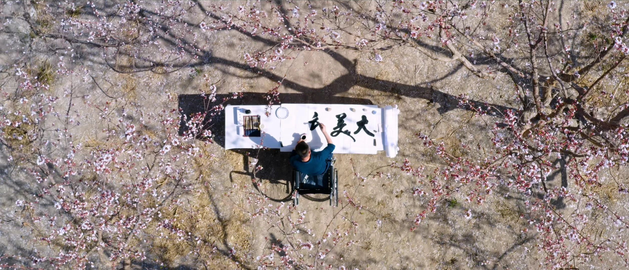 图为《上春山》视频拍摄时残疾人书法家在吐鲁番看杏花书写大美新疆
