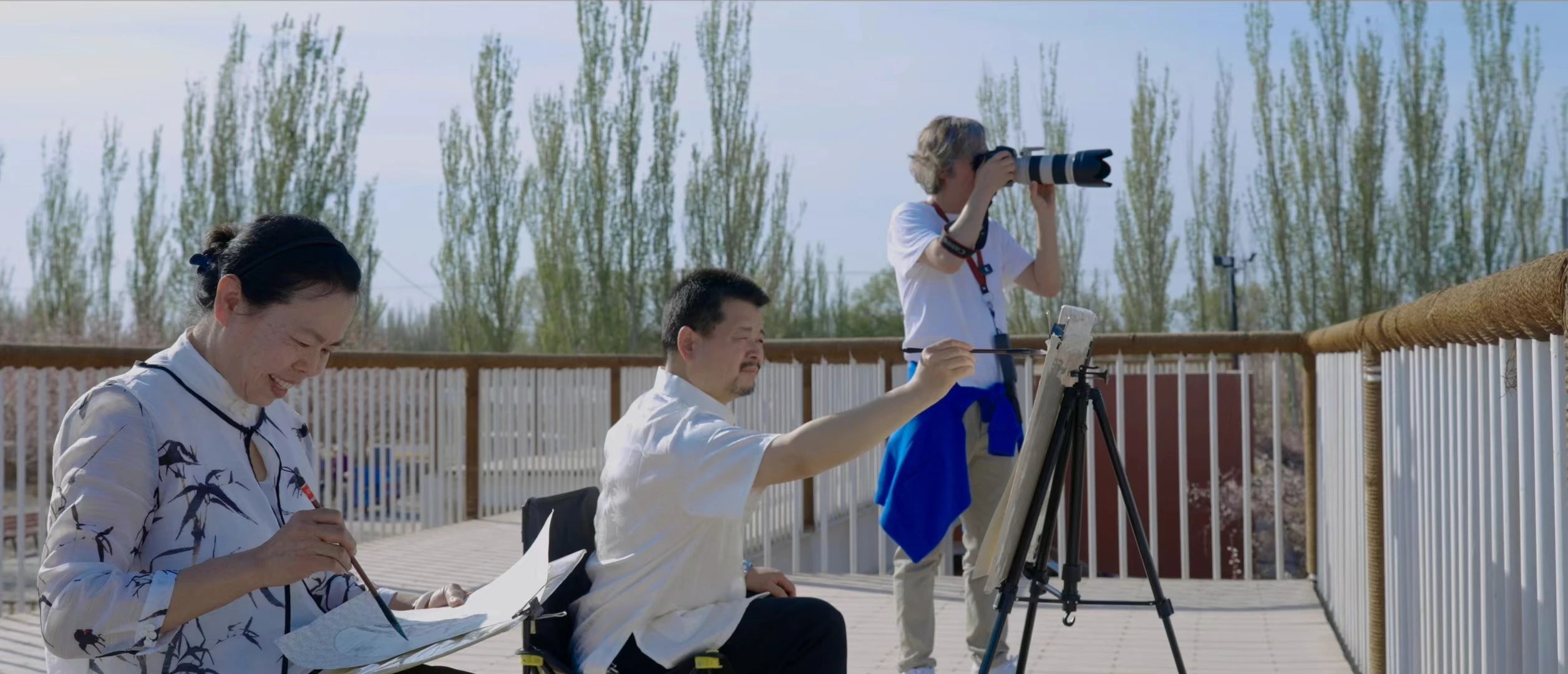 图为《上春山》视频拍摄时残疾人摄影师、艺术家在吐鲁番采风、创作