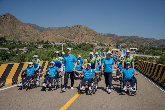 图为在大同天镇李二口长城,残疾人和残疾人工作者手牵手开展健步走活动