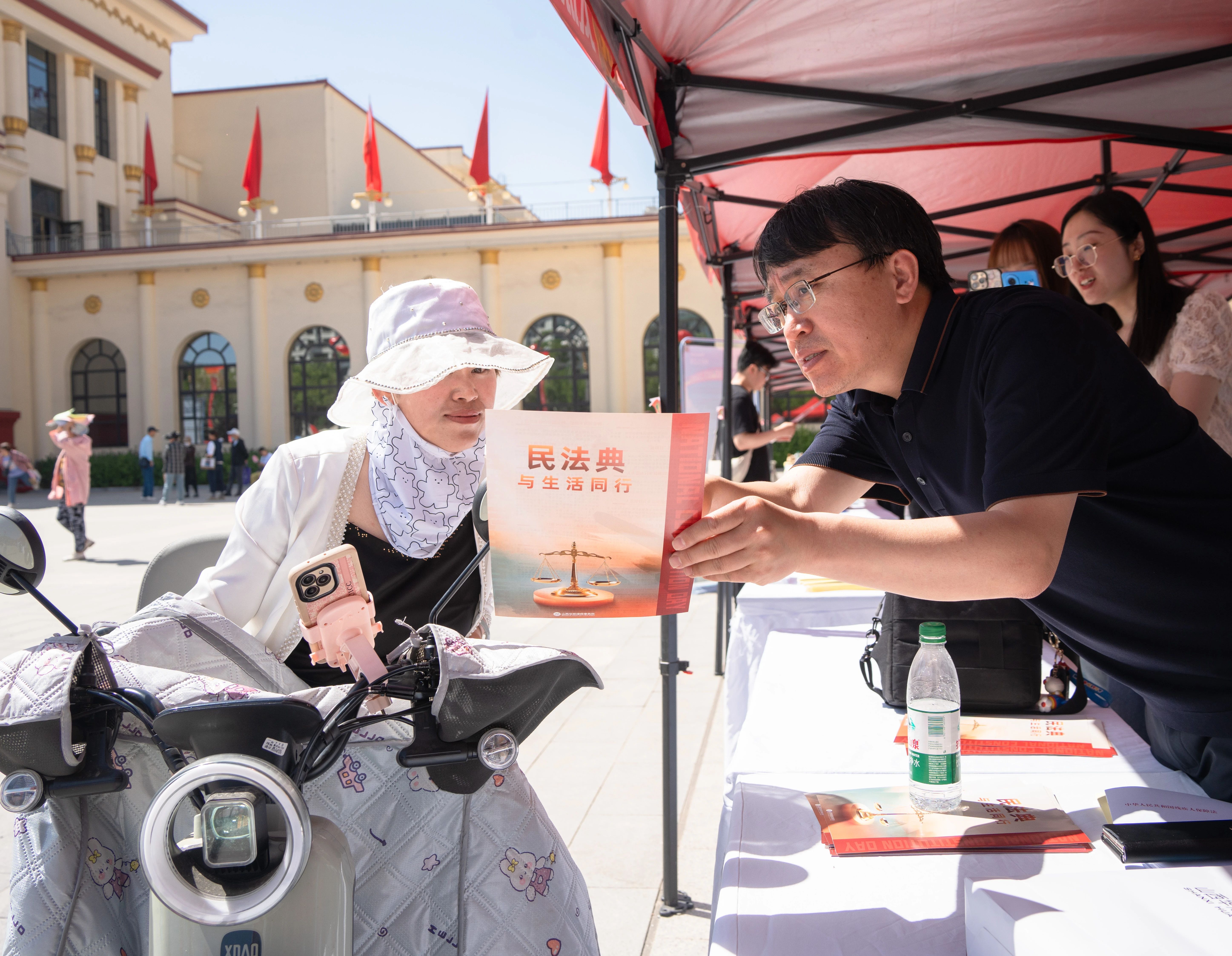 图为民法典宣传月,志愿者向残疾人普及法律知识