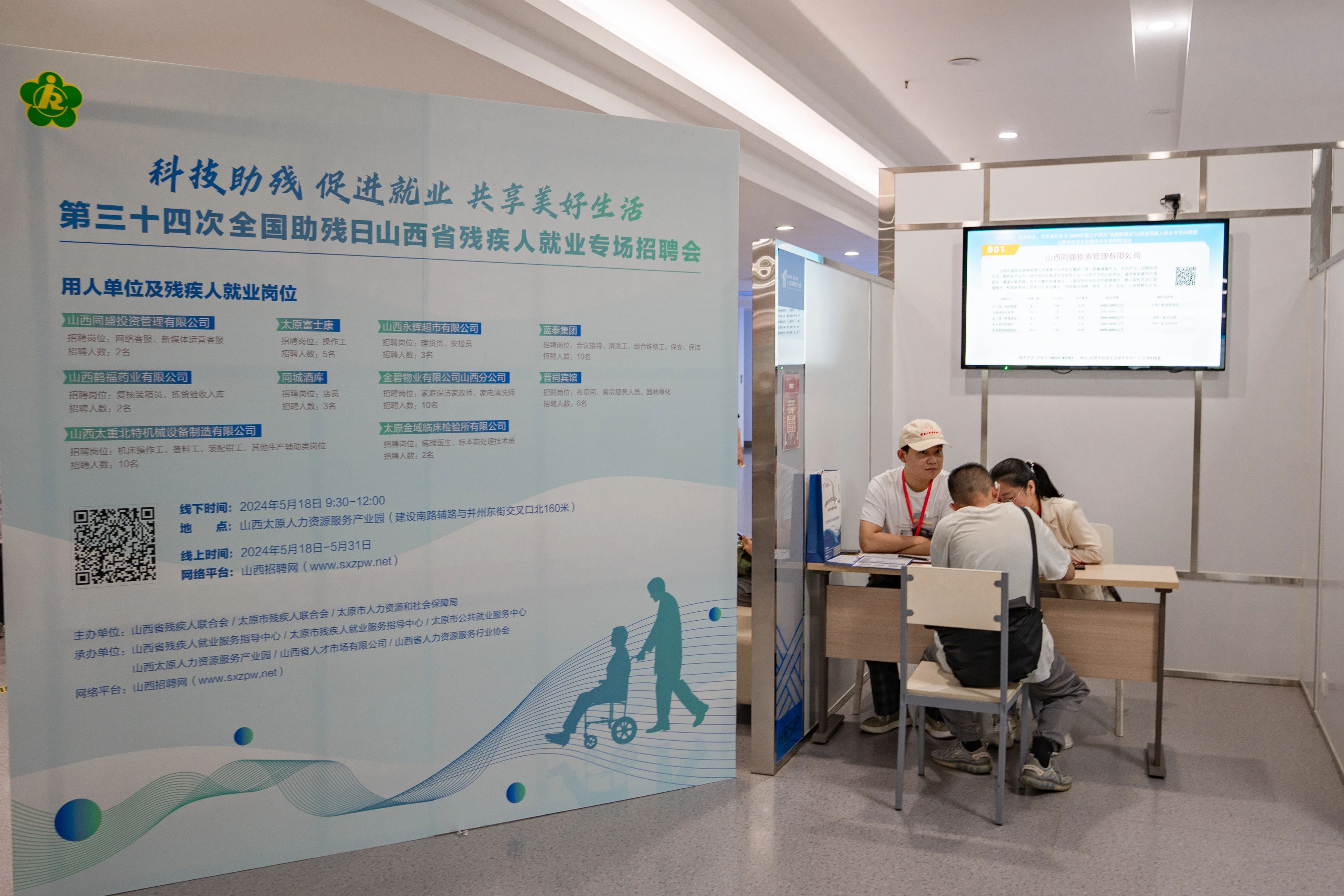 图为省残疾人就业专场招聘会现场,残疾人求职者在填写简历
