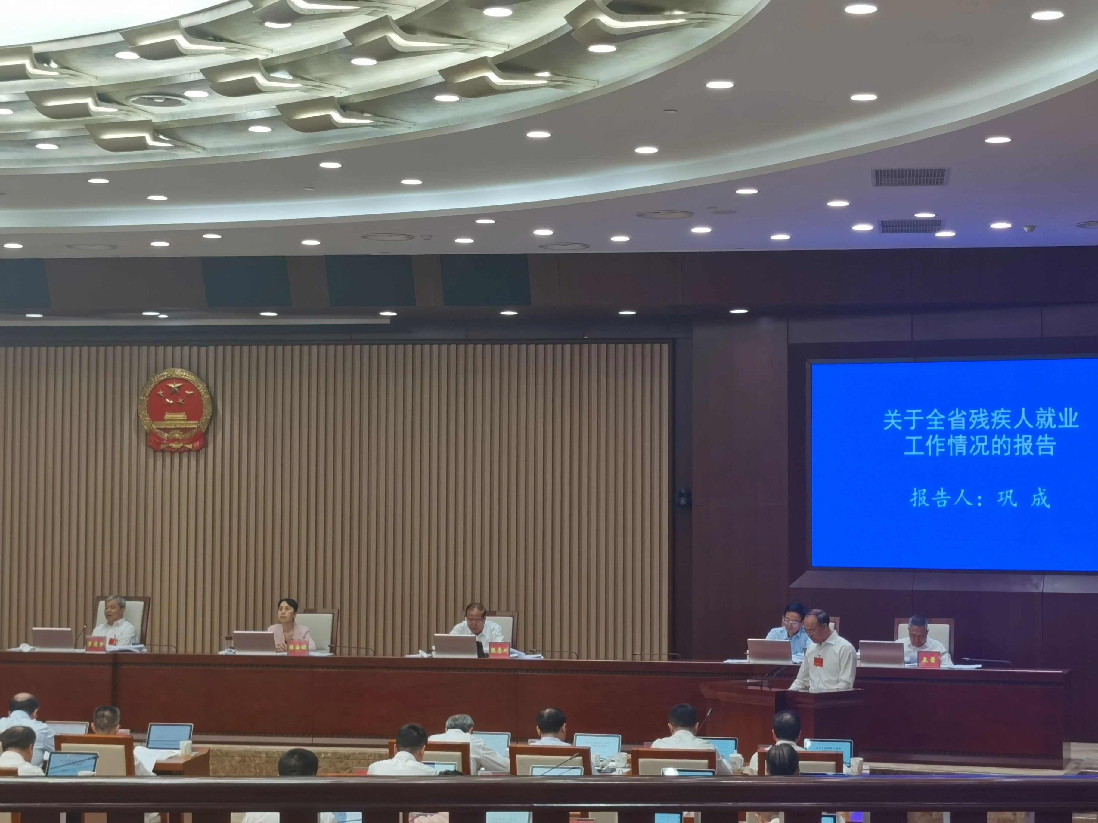 图为省残联党组书记、理事长巩成向省人大报告全省残疾人就业工作情况