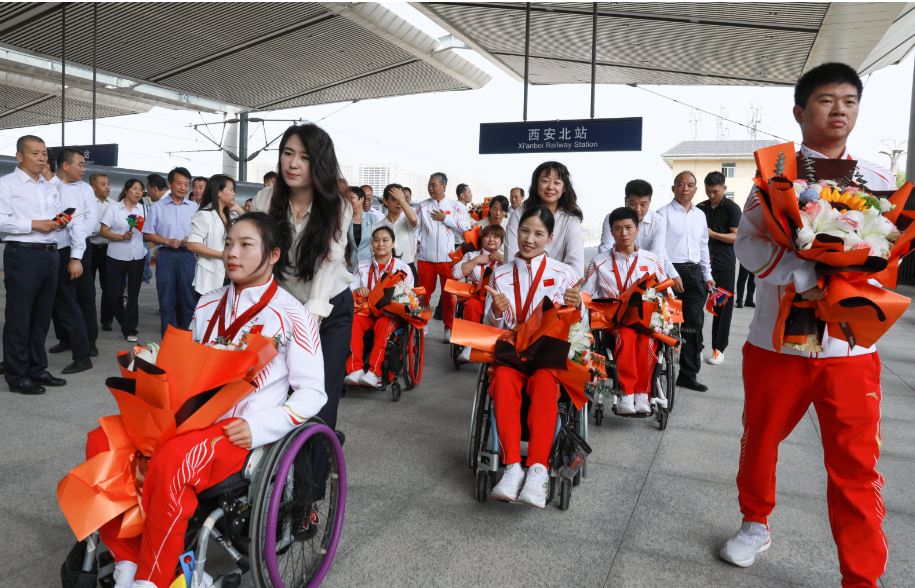图为9月11日,参加巴黎残奥会的陕西10名运动员、1名领队、1名教练员抵达西安北站